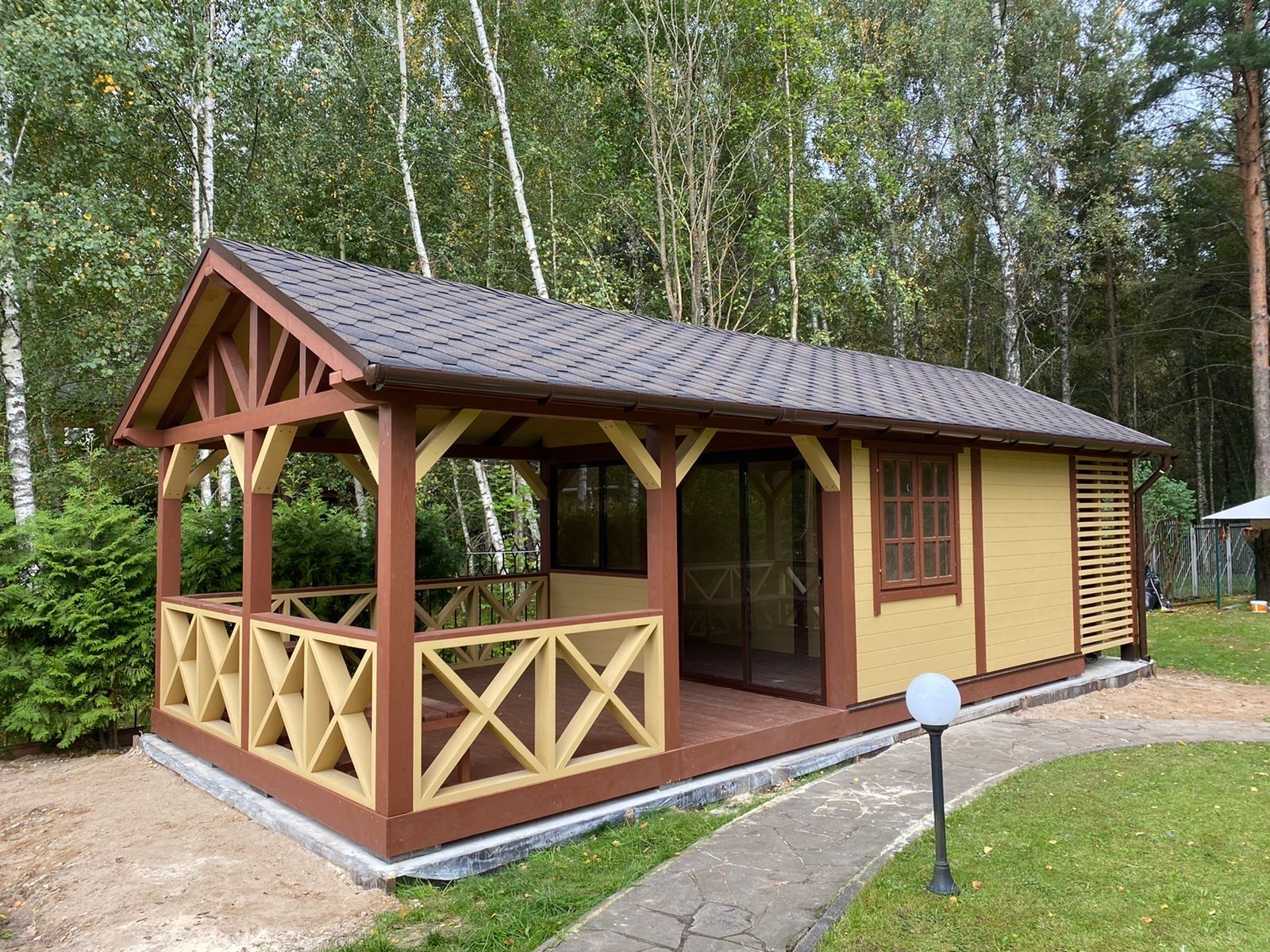 Конструкция изготовлена из хвойных пород древесины (ель, сосна). Материал — массив сухой строганный камерной сушки + клееный брус. В крепеже не используем черных саморезов, только желтопассированные. Крепеж не является сборно – разборным..
