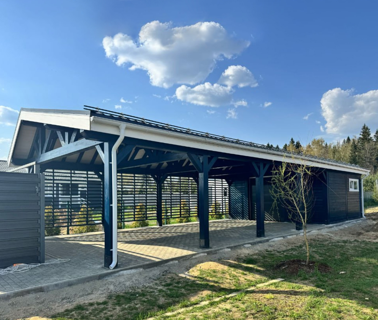 Навес для автомобилей Аларес — это функциональное и сбалансированное решение для защиты двух транспортных средств на компактной территории. Габариты 6,6×5,1 м и площадь 34 м² позволяют разместить автомобили с удобными проходами и достаточным пространством для открывания дверей, не занимая лишнюю землю на участке. Коньковая крыша с двумя скатами обеспечивает эффективный водоотвод и предотвращает скопление снега, что особенно важно в условиях частых осадков. Каркас выполнен из высококачественной хвойной древесины, прошедшей камерную сушку, что исключает деформации и гарантирует долговечность строения. Отсутствие хозблока делает всю полезную площадь доступной для парковки, а грамотная конструкция позволяет органично вписать навес в любой ландшафт. Кровельное покрытие из битумной черепицы "Shinglas" обеспечивает надежную защиту от осадков и придает навесу законченный вид.