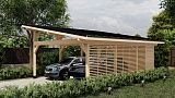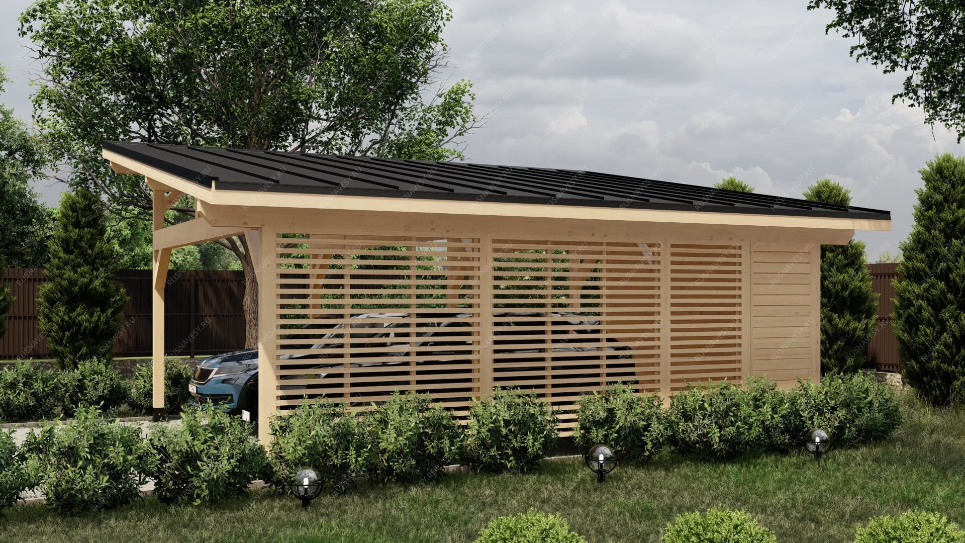 Односкатный навес РАЙБЛ размером 8,9×6,3 метра с хозяйственным блоком создан для надежного укрытия двух автомобилей и организации дополнительного функционального пространства. Эргономичная конструкция с наклонной кровлей обеспечивает эффективный отвод осадков без образования луж на поверхности. Каркасная система изготовлена из отборной древесины хвойных пород, прошедшей контролируемую камерную сушку, что гарантирует минимальную усадку и стабильность геометрических параметров на протяжении всего срока службы. Основные несущие элементы выполнены из массива бруса сечением 190×190 мм, обеспечивающего высокую прочность при сохранении эстетической привлекательности. Наружная обшивка представлена профилированной имитацией бруса 21 мм с замковым соединением шип-паз, предотвращающим образование щелей и обеспечивающим плотное прилегание элементов. Внутреннее помещение хозблока отделано аналогичным материалом толщиной 16 мм, формируя комфортное пространство для хранения инвентаря и сезонных принадлежностей. Кровельная система оснащена финской гибкой черепицей Shinglas коллекции "Соната", обладающей высокой устойчивостью к атмосферным воздействиям и сохраняющей свои свойства в условиях резких температурных перепадов. Все деревянные элементы подвергнуты обработке современными защитными составами, предотвращающими развитие грибковых колоний, растрескивание и поражение насекомыми. По желанию заказчика доступны альтернативные варианты кровельных материалов, включая металлочерепицу и фальцевые покрытия в различных цветовых решениях по шкале RAL. Конструкция адаптирована для установки на разные типы оснований: винтовые сваи, ленточный фундамент или монолитную плиту. Дополнительная опция — нанесение профессиональной пропитки Tikkurila Ultra, гарантирующей сохранение эксплуатационных характеристик на 7-10 лет. В комплектацию входят металлическая дверь повышенной прочности и деревянное окно с одинарным остеклением, обеспечивающее естественное освещение внутреннего помещения. Технологичная сборка с соблюдением всех строительных норм гарантирует долговечность и безупречный внешний вид навеса, гармонично вписывающегося в архитектурный ансамбль любого загородного участка.