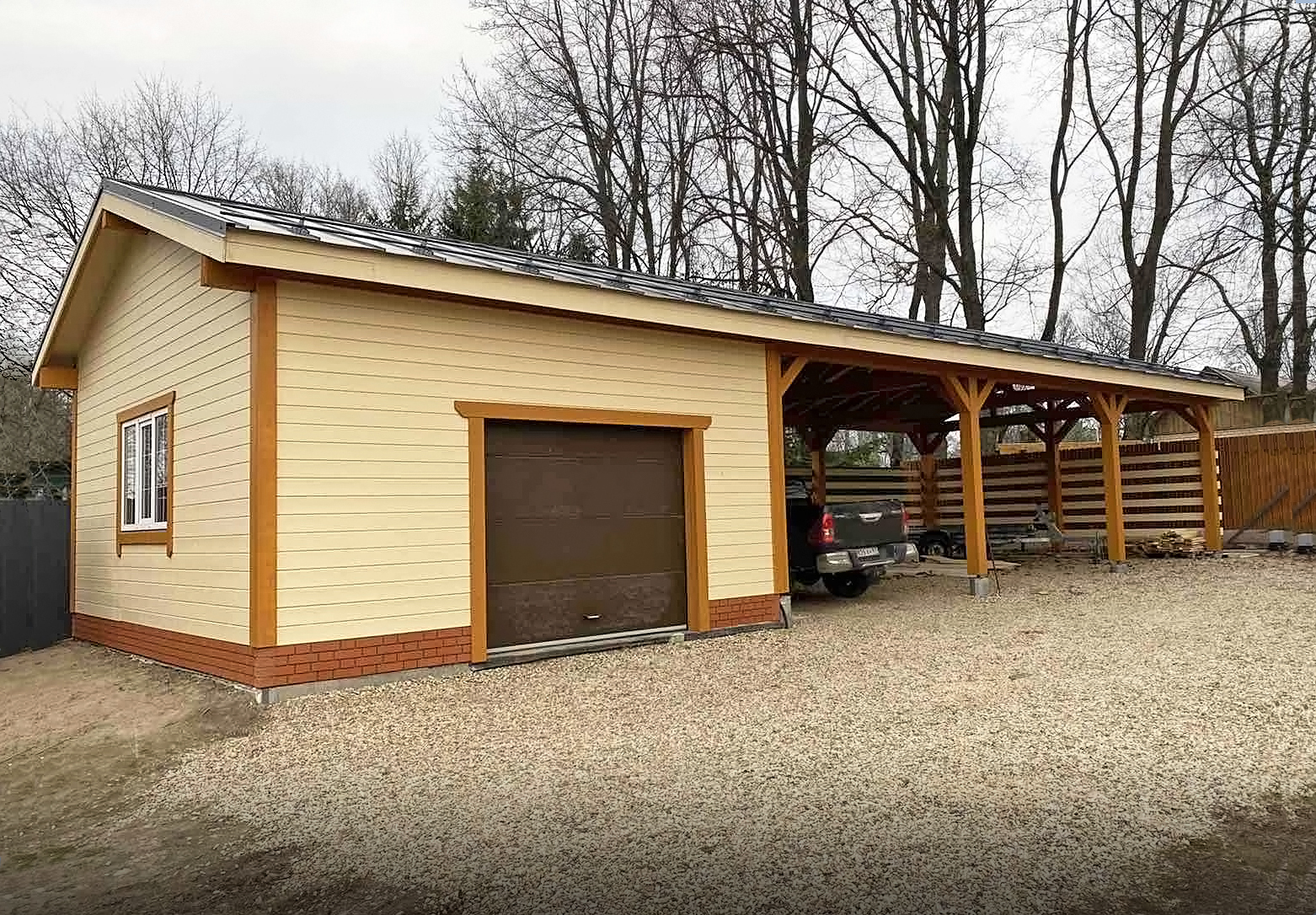 Двухскатный навес ВИЛЬЯМ габаритами 8×7 метров с интегрированным хозяйственным блоком создает пространство для одновременной парковки двух автомобилей и организации функциональной зоны хранения. Архитектурное решение с классической двускатной кровлей обеспечивает естественный сток осадков, предотвращая скопление снега и воды на поверхности. Основа конструкции сформирована из высококачественного хвойного массива камерной сушки, прошедшего специальную обработку для минимизации усадки и деформации в процессе эксплуатации. Несущие стойки выполнены из бруса 190×240 мм, обеспечивающего повышенную устойчивость к ветровым нагрузкам и гарантирующего долговечность сооружения. Наружная отделка хозблока представлена профилированной имитацией бруса 21 мм с замковым соединением шип-паз, исключающим образование щелей и обеспечивающим надежную защиту от внешних воздействий. Внутреннее пространство хозблока обшито аналогичным материалом толщиной 16 мм, создавая комфортную зону для хранения инвентаря. Кровельное покрытие из финской гибкой черепицы Shinglas коллекции "Соната" обладает высокой эластичностью и устойчивостью к перепадам температур, сохраняя свои свойства в экстремальных климатических условиях. Все деревянные элементы обработаны защитными составами, препятствующими гниению, воздействию ультрафиолета и атаке насекомых. В комплектацию входят металлическая дверь повышенной прочности и деревянное окно с одинарным остеклением, обеспечивающее естественное освещение внутреннего помещения. Дополнительные опции включают выбор альтернативных кровельных материалов, установку на различные типы оснований и нанесение защитной пропитки Tikkurila Ultra с сохранением качества на 7-10 лет. Качественная сборка и внимание к деталям делают навес ВИЛЬЯМ практичным и эстетичным дополнением к любому частному участку.
