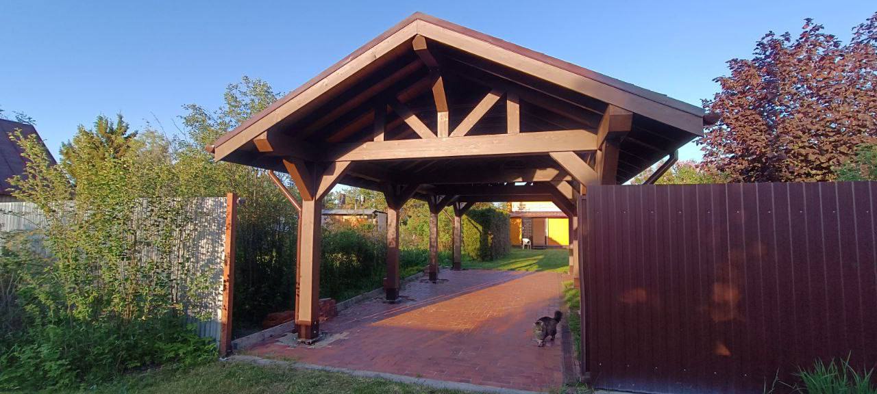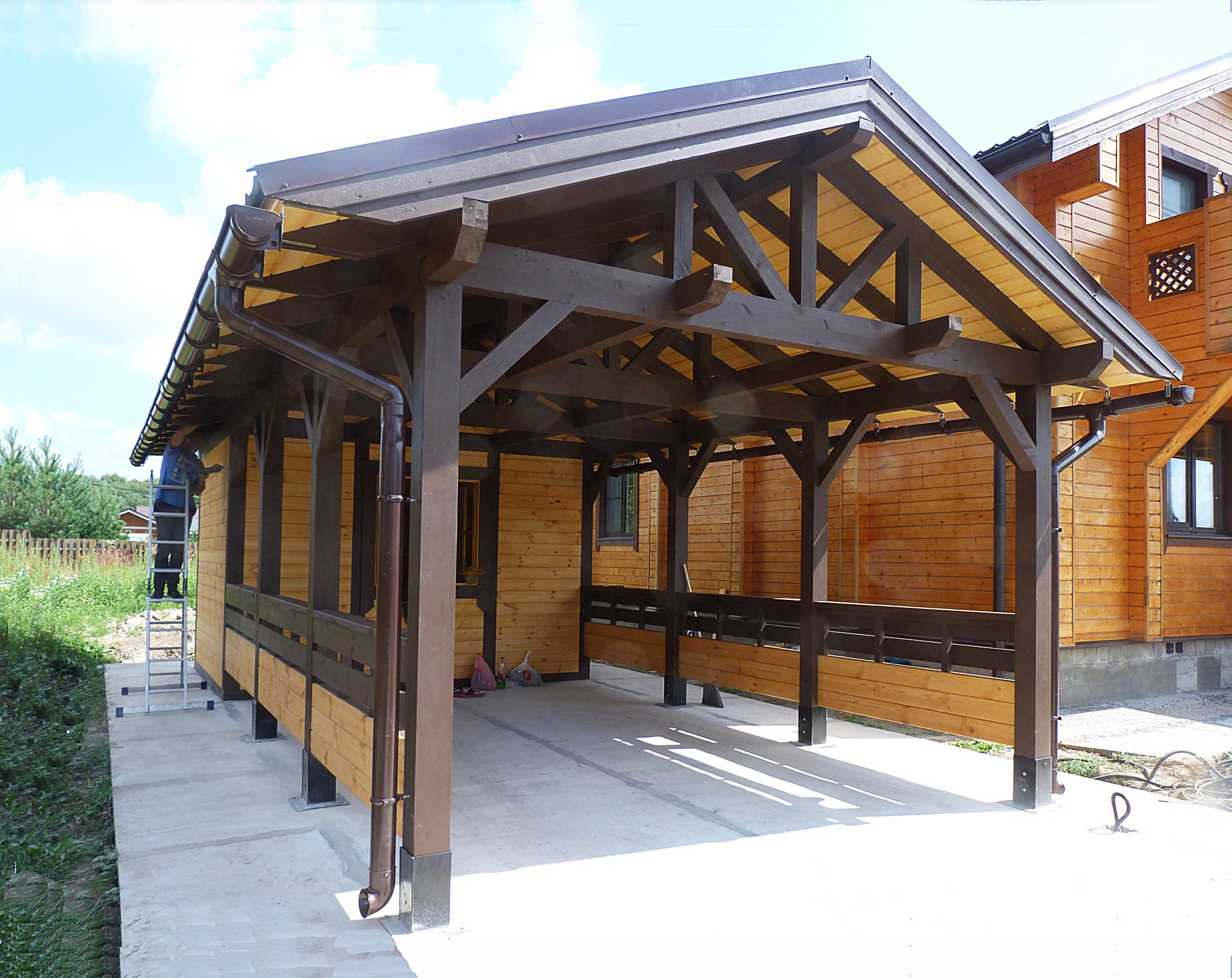Деревянный навес на загородном участке – очень полезное, а порой и незаменимое сооружение. Он подходит для разных целей: для парковки автомобиля, обустройства зоны отдыха, хранения садового инвентаря, в качестве пристройки к дому. Помимо основного назначения, навес из дерева, как правило, выполняет декоративную функцию, создавая гармонию с домом и окружающей природой. Среди достоинств уличных деревянных конструкций: