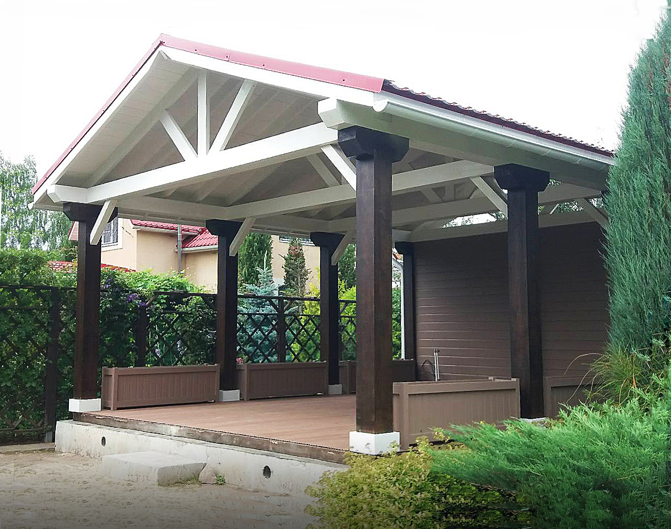 Деревянный навес на загородном участке – очень полезное, а порой и незаменимое сооружение. Он подходит для разных целей: для парковки автомобиля, обустройства зоны отдыха, хранения садового инвентаря, в качестве пристройки к дому. Помимо основного назначения, навес из дерева, как правило, выполняет декоративную функцию, создавая гармонию с домом и окружающей природой. Среди достоинств уличных деревянных конструкций: