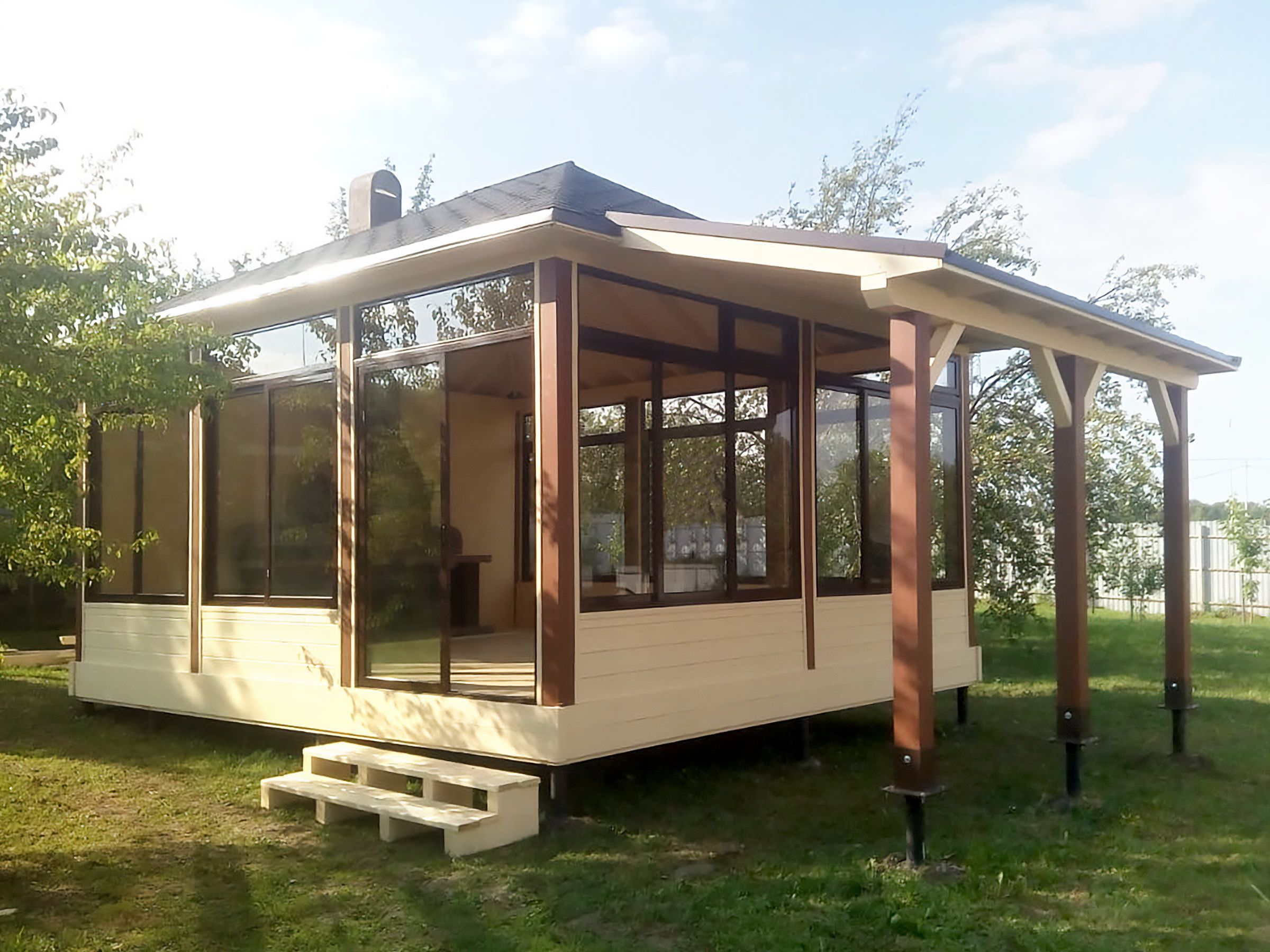 Изделия из клееного бруса предлагаются в трёх комплектациях: «несущий каркас», «базовая» и «премиум». В последнем случае стойки выполнены не из цельного массива дерева, а из клеёного бруса, а обрешётка кровли – из имитации бруса с замковым соединением.